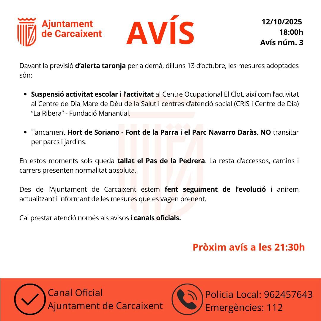«⚠ AVÍS DE SERVEI MUNICIPAL: Per a demà, dimarts 4 de març, se suspén l’activitat escolar a Carcaixent. A més, se suspén l’activitat al Centre Ocupacional El Clot, Centre de Dia Mare de Déu de la Salut, Conservatori Mestre Vert i al Centre d’Atenció Social (CRIS i Centre de Dia) “La Ribera” Fundació Manantial. «