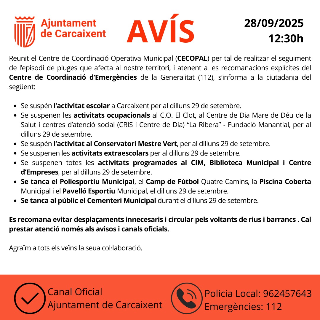 El Centre de Coordinació Operativa Municipal (CECOPAL) ha suspés les classes per a aquest dilluns, 29 de setembre, degut a l’avís roig per fortes pluges. Per tant demà el centre estarà tancat.
